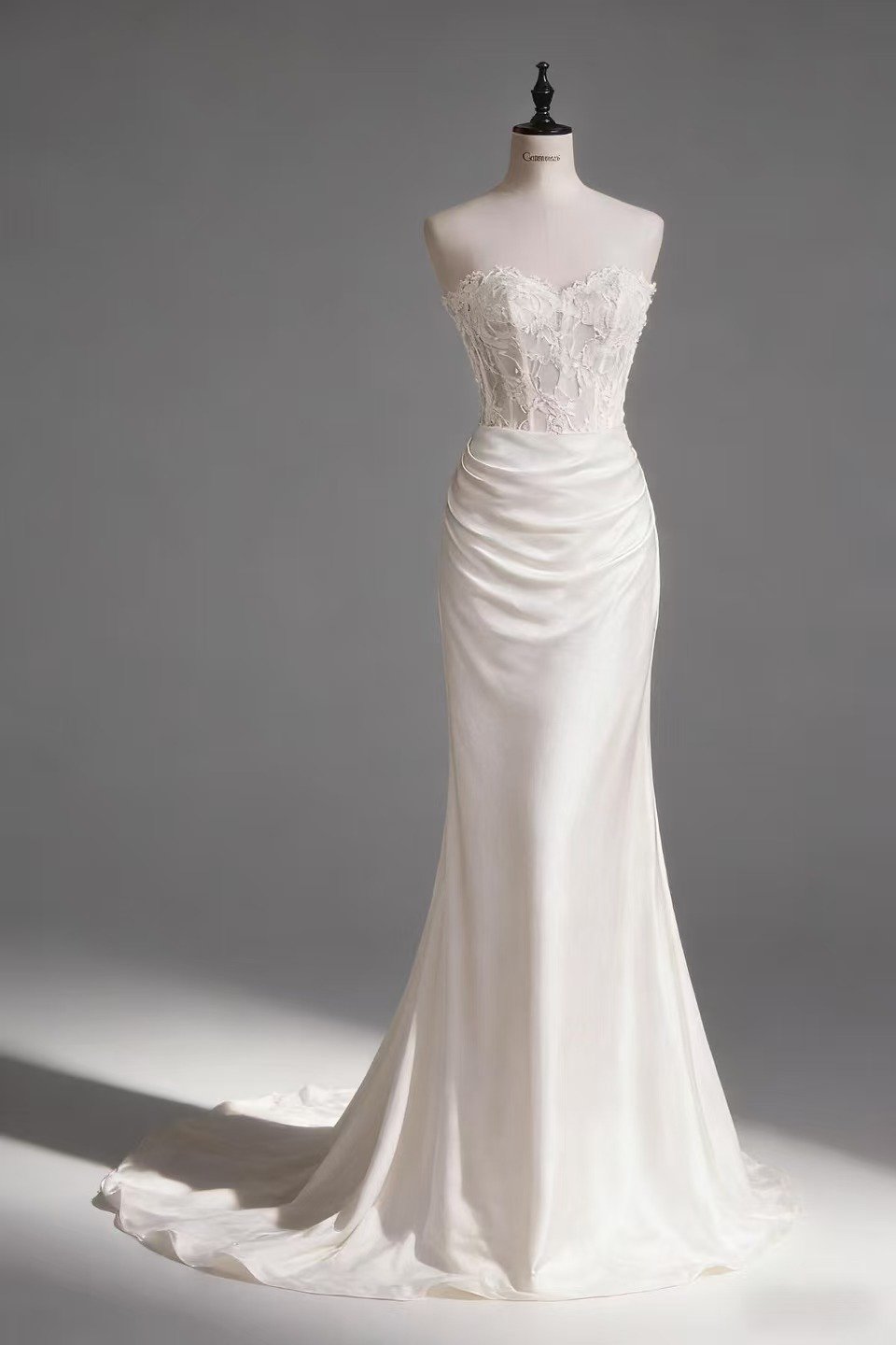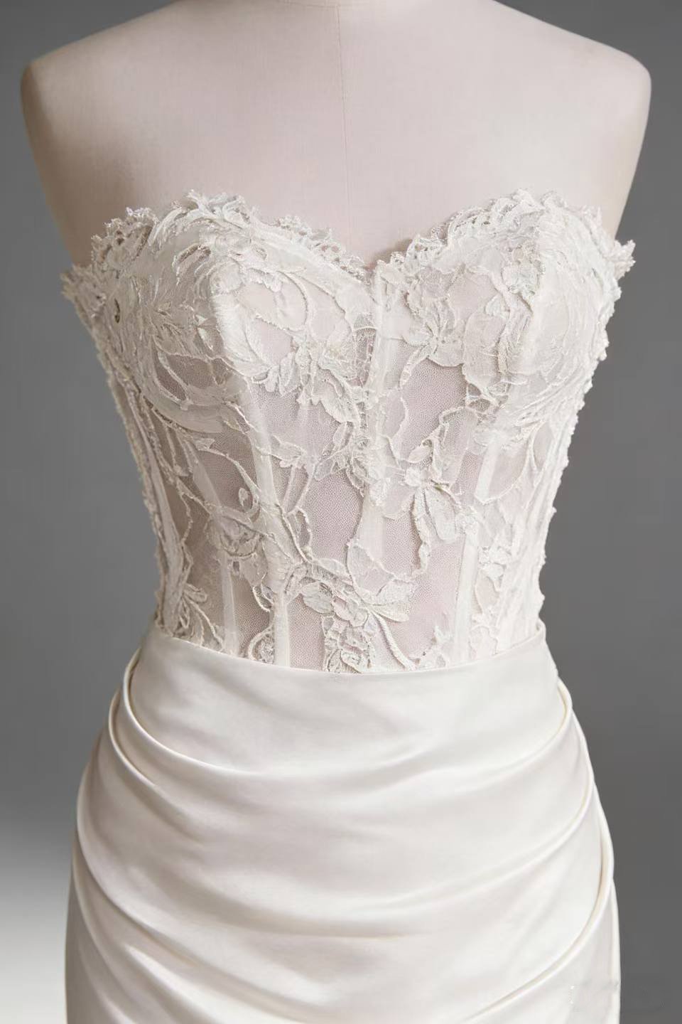 Luxury satin skirt with delicate lace corset bodice, flattering fit, and lightweight fabric perfect for tropical beach weddings.